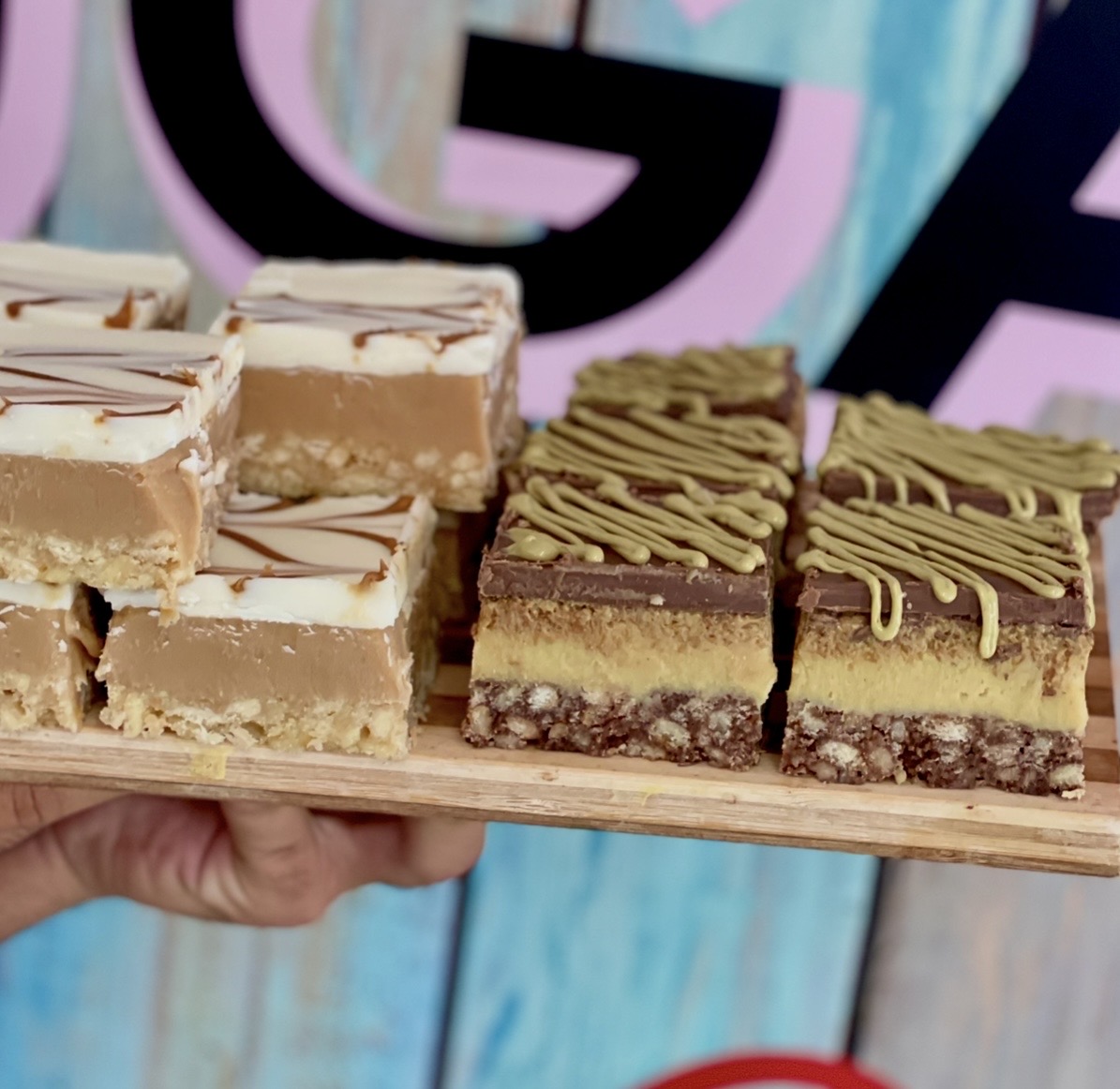 Chocolate Caramel Slice, Biscoff Fudge, Red Velvet slice, Kinder Bueno Slice, Birthday Cake, Vanilla Fudge Cake, Pistachio Fudge Slice, Dubai Chocolate Slice, Cookie Dough, Cappuccino Slice and more