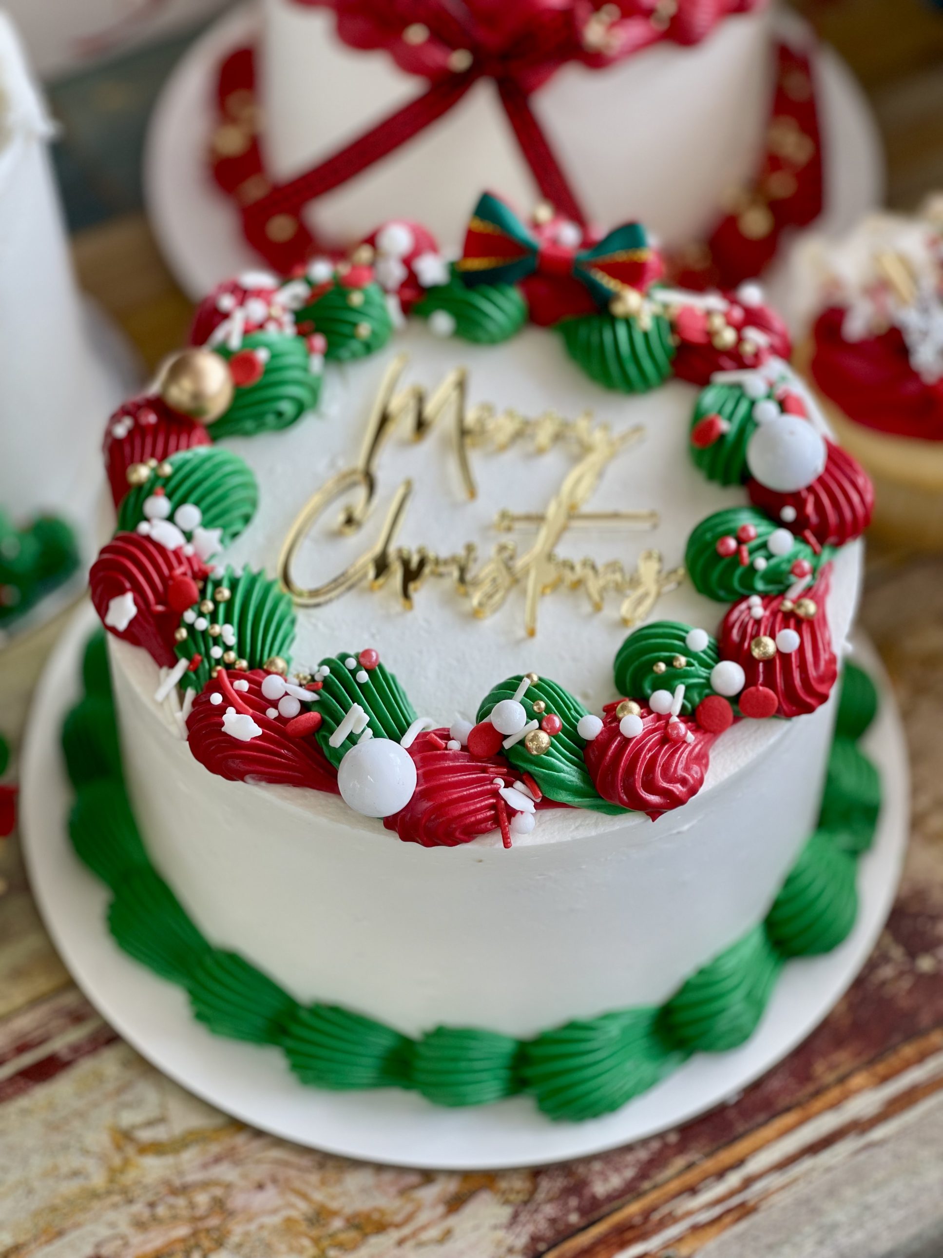 Christmas Wreath Cake with mini Christmas decorations in a festive colour combo. The perfect gift or centrepiece cake for Christmas Day!