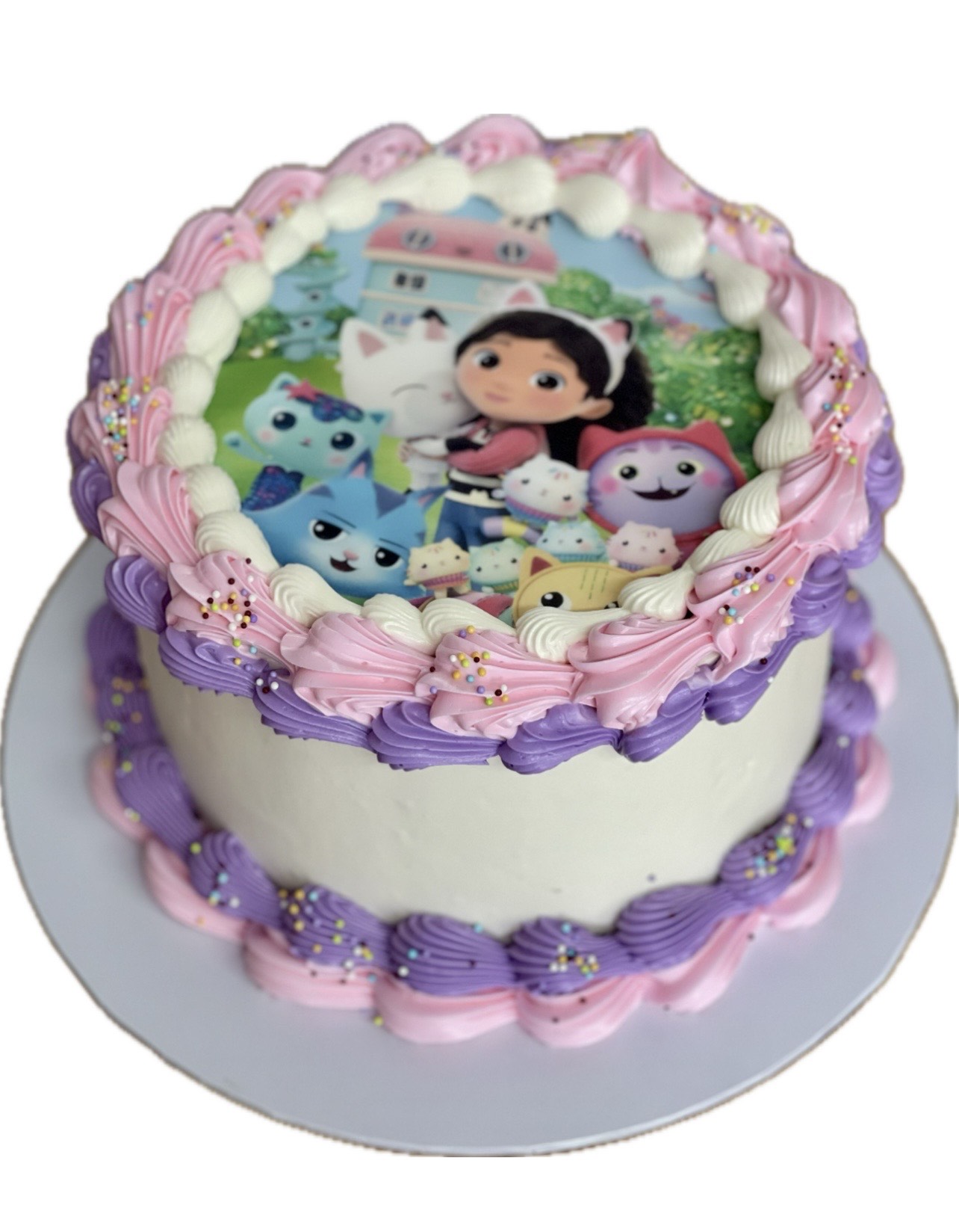 Choose your own image to add to your cake. This is a white cake base with 2 layers of piping on top and 2 on the bottom plus sprinkles. We can add a small piped border around the photo also.