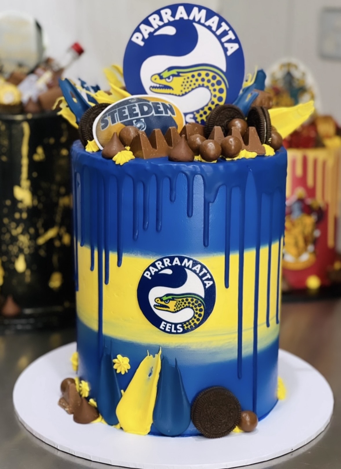 If you prefer a different sports team, write this in the notes section at checkout. This cake comes with a Logo, edible 2d football images, drip, choc shards & assorted chocolates. We can add different colours / balls, drip etc for a different team.
