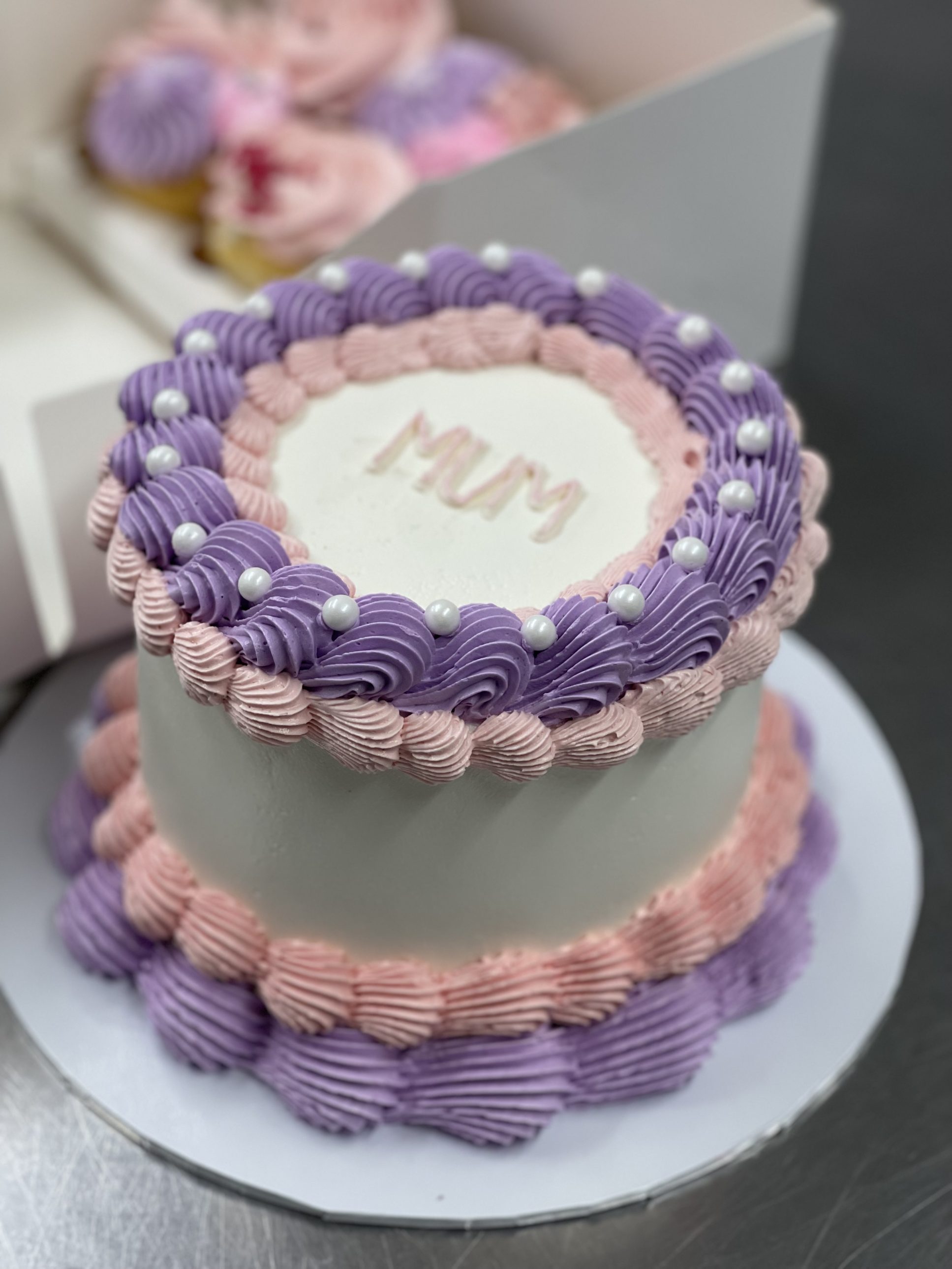 6 inch mums day cake special – vanilla with vanilla buttercream! Mum will be piped on top in pink buttercream. Special for Mothers Day 2025!