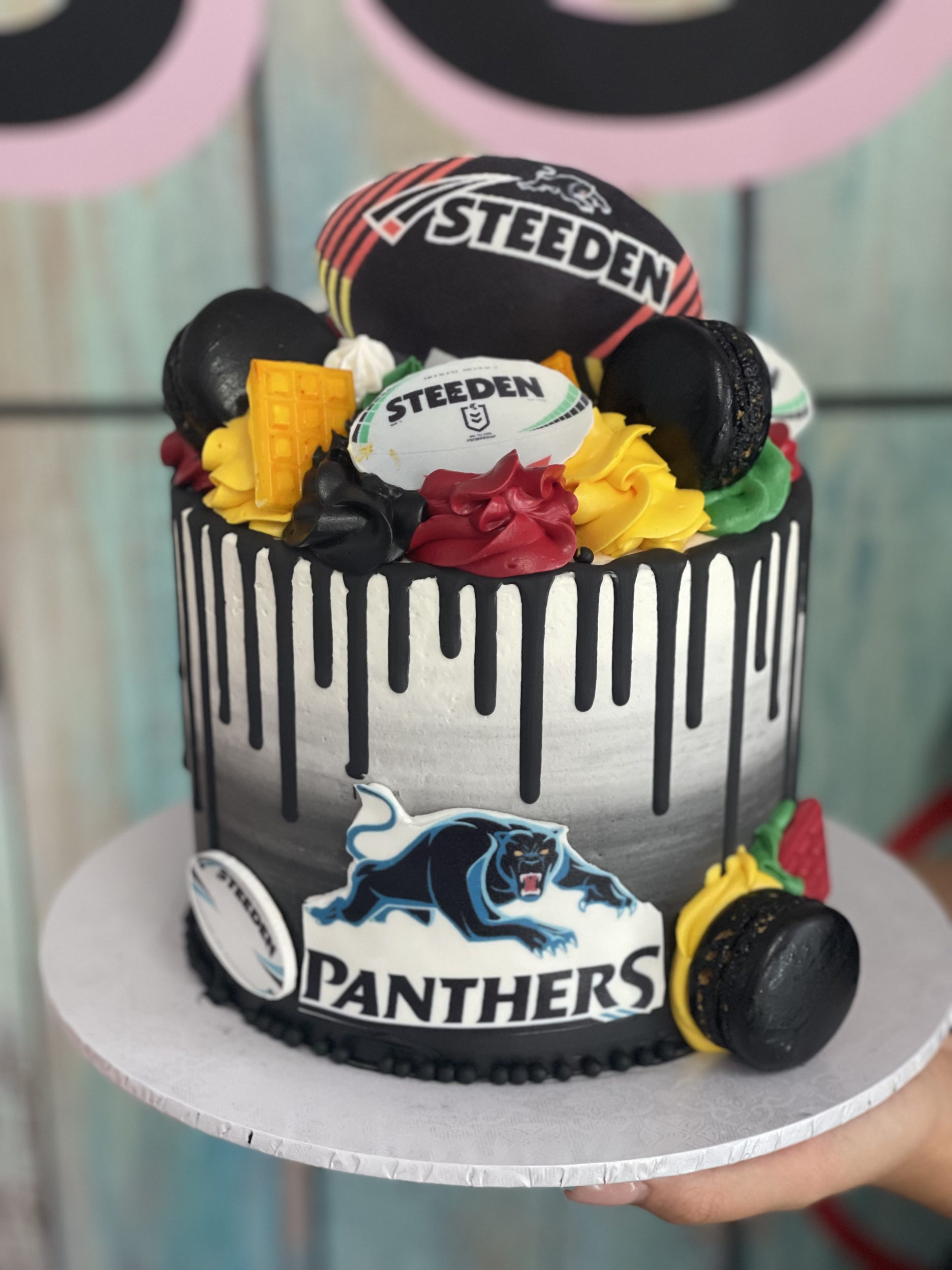 If you prefer a different sports team, write this in the notes section at checkout. This cake comes with an edible standing football image, drip, mini footballs, macarons & mini chocs. We can add different colours / ball for a different team.